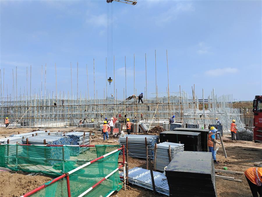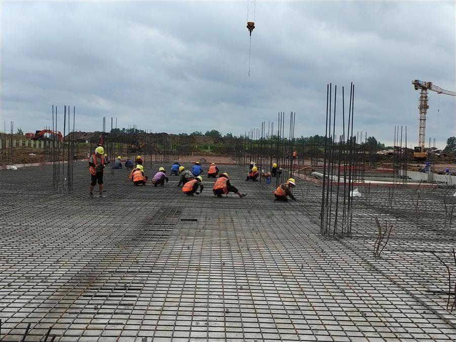 “日均投入施工技術人員500余人、各類機械設備45臺搶抓施工節(jié)點。”項目負責人禤旭云說,自6月開工以來,針對項目工期緊、任務重的情況,項目部按照“開工即攻堅、起步即沖刺”的要求,全面推進項目建設。目前,中試車間基礎回填、褥墊層鋪筑、墊層澆筑、剛性地面鋼筋綁扎完成;1#生產車間53~56軸獨基開挖基礎承臺鋼筋綁扎、模板安裝、砼澆筑完成,48~52軸基礎開挖、墊層澆筑完成;2#生產車間18~25軸基礎承臺鋼筋綁扎、模板安裝、砼澆筑完成;倉庫基礎梁全部完成。