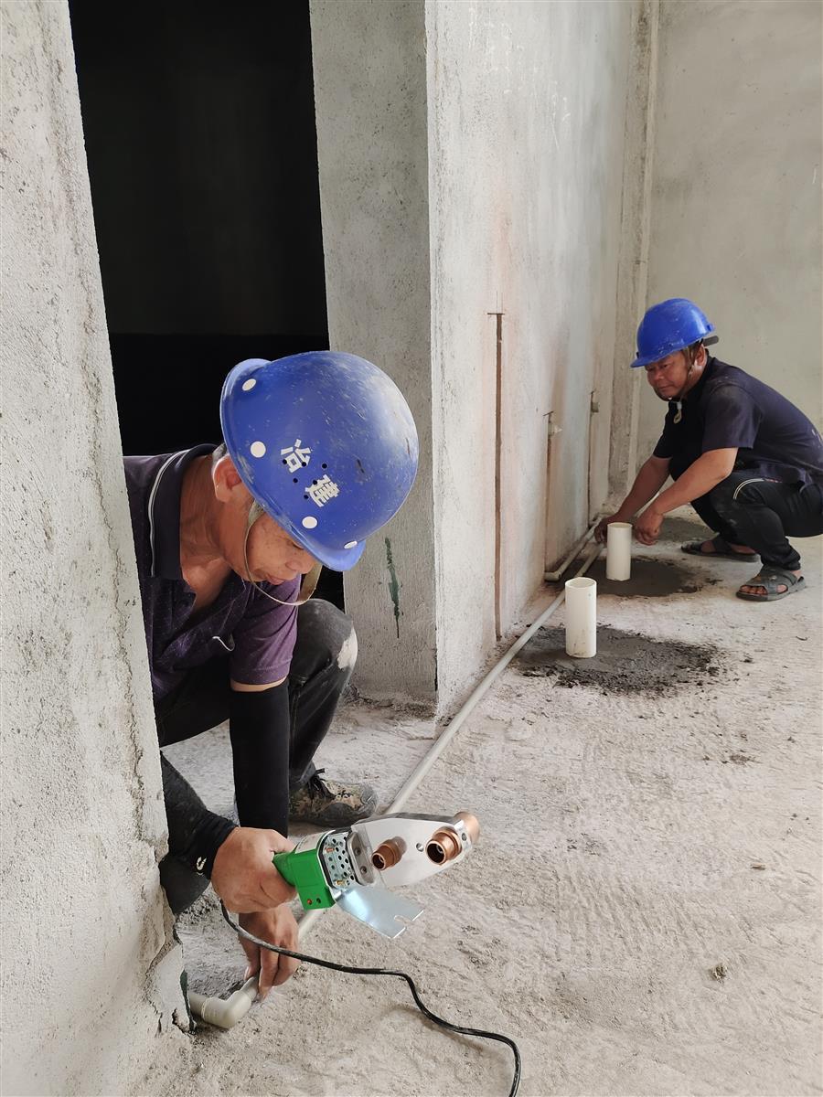廣西思高香料有限公司食品香精香料及煙用添加劑生產(chǎn)基地項目辦公綜合樓、1#-3#廠房及門衛(wèi)室項目,工人在安裝管道。