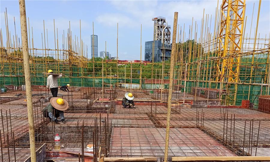 柳州市第三棉紡織廠集資建房項目36#樓、37#樓、38#樓、公廁及垃圾收集點(diǎn)項目,工人正在進(jìn)行綁扎鋼筋和搭設(shè)腳手架。