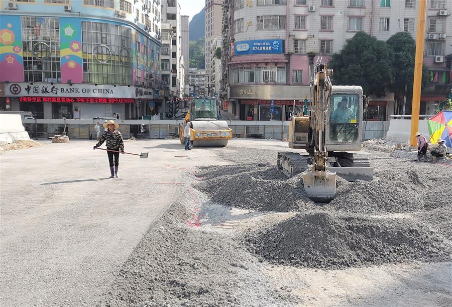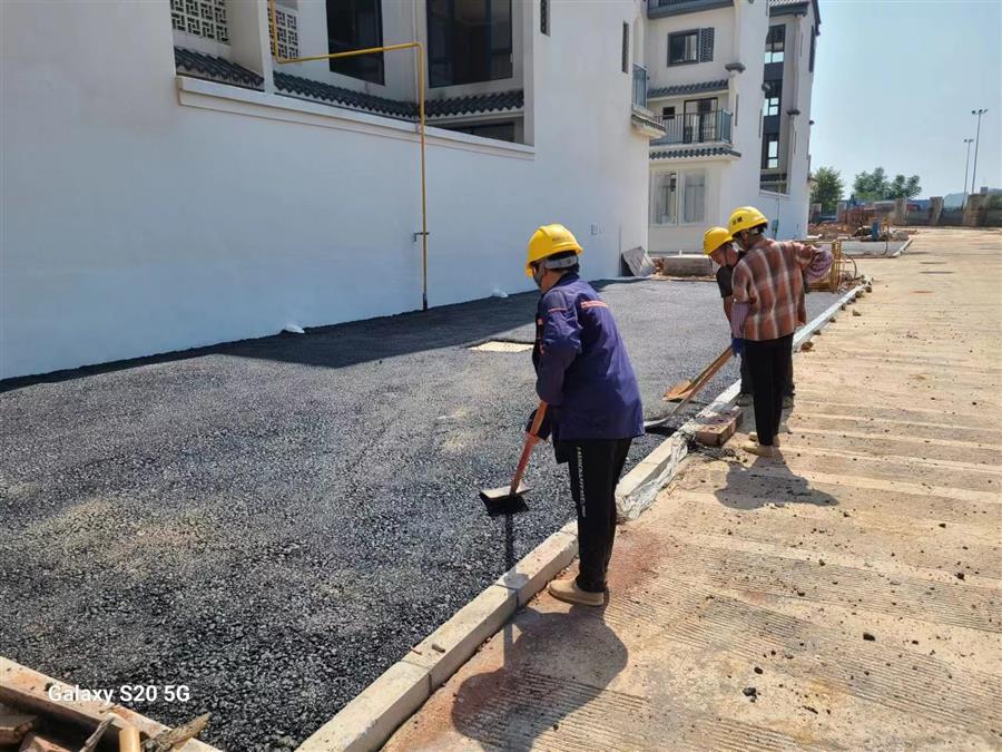 鹿寨縣城南新區(qū)城中村改造項目設(shè)計-采購-施工(EPC)總承包項目,工人正在對室外道路鋪設(shè)瀝青。