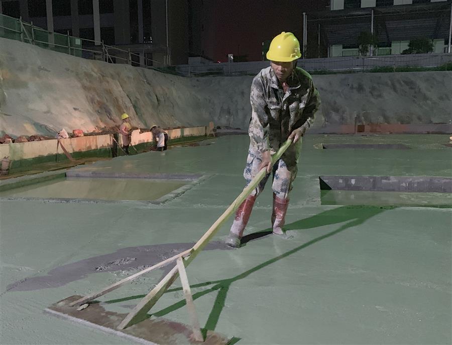 河池羅城供電局本部技術(shù)業(yè)務(wù)用房項目,工人加班進(jìn)行基礎(chǔ)抗水板墊層澆筑。
