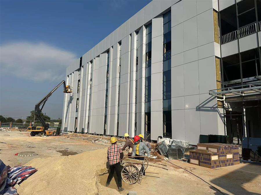 目前,項目1#聯(lián)合廠房外立面均已完成,室內消防、鋼結構等均已安裝完畢,暖通以及水電工程、室內燈具、器具等正在安裝中。庫房、門衛(wèi)室主體結構已完成、室內燈具、器具等正在安裝中。