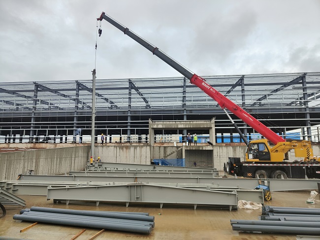 鋼結構首吊是項目施工的重要節(jié)點,項目部結合現(xiàn)場情況,堅持方案先行,在吊裝前對施工任務及施工重點進行了充分研討,對吊裝作業(yè)進行全面安全技術交底,對大型機械、吊索吊具等進行逐項驗收,統(tǒng)一管理,確保吊裝施工順利進行。