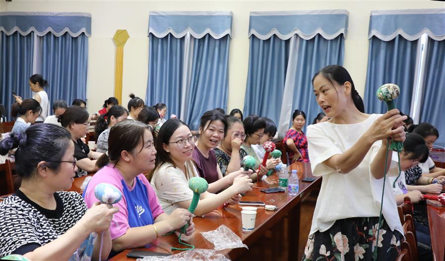課堂上,培訓(xùn)老師王春梅為大家詳細(xì)講解了艾草養(yǎng)生錘的功效和用途,并演示了其制作方法和步驟。“將錘柄插入艾草包,拉緊艾草包,然后將其放在布料三分之一處,捏成一個(gè)緊實(shí)的圓球……”在王老師的指導(dǎo)下,女職工們積極參與,跟著老師的指導(dǎo)一步一步地制作自己的養(yǎng)生艾草錘。大家認(rèn)真細(xì)致的聽講并按步驟制作,不久一把把色彩鮮艷、質(zhì)量上乘的艾草養(yǎng)生錘相繼“出爐”。大家互相試用,現(xiàn)場(chǎng)洋溢著歡聲笑語。